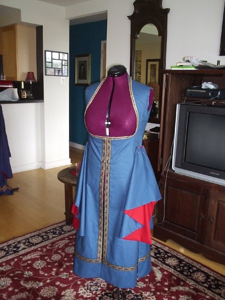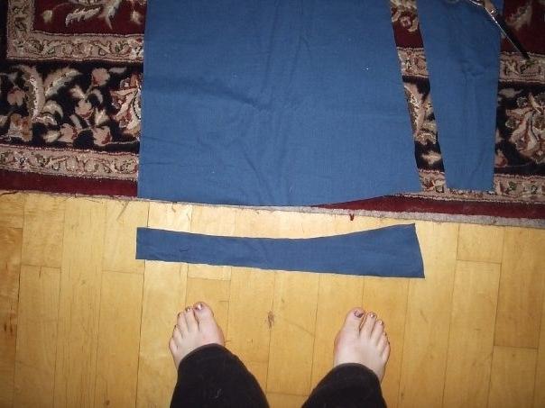 Although no one in history ever wore the large half oval drapes on a Ghawazee coat, I think they're pretty. To make the drapes pictured below (pinned to the costume) I just cut out two half ovals of the blue, and two of the red. Sew them good-sides in, and cut a little half circle so they can attach to the bottom of your sleeve, trim the raw edges inside, and then pull them right-side-out through the half circle hole you made. Use or R = (pi)/C, where C is the distance around your the bottom edge of your sleeve plus 1 inch (seam allowance), to determine how to make that elbow hole. Baste stitch (fancy word for top stitching with a straight stitch to keep two layers of fabric together) the elbow hole.