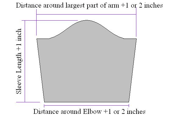 If your coat will be sleeveless you can fold in your arm hole's raw edges, top stitch it, add trim, and then start sewing in your hooks and eyes and call it a day. I like sleeves, myself. Modern sleeves have a hump at the top. It's designed to make the sleeve lay nicely while the arms are down. Medieval sleeves, on the other hand, are just parallelagrams, designed for the arms to be straight out. The total length is the same, and you end up with more bunched up fabric in your arm pits when the arms are down. If the hump intimidates you, just do a medieval sleeve. Or you could sacrifice an old shirt and use the top of it as a pattern. For either, measure the largest part of your upper arm and add an inch or two for the widest width, and then measure around your elbow and add an inch or two. Here is a drawing of a modern sleeve.