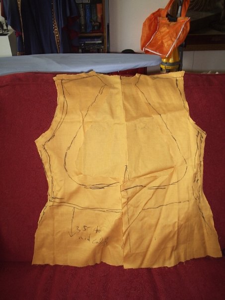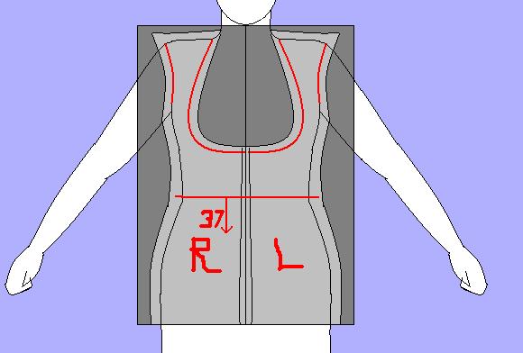 If this coat will not cover your bra area (because you want to wear it with a modern bellydance coin bra, or you're making a Turkish Vest), then use a marker or fabric pencil to draw where you'd like the edge of your coat to be (see the red line in the image below), and cut your fabric about an inch away from that line. If instead you want it to lay over breast, you may find the need to add darts on the front panel so that they better fit your chest, creating triangular fold from the apex of the breast (the nipple) to the armpit. Listen to your fabric and your body shape and work with the fabric here, not against it. As before, put your pins in along where your seam would lie.