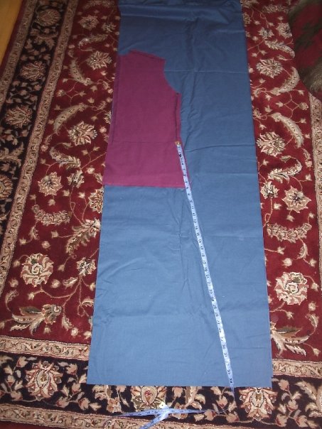 In any case, here is how you use your pattern pieces to make your four panels. Folding your fabric in half widthwise (so you cut out two panels at once), pin one of your two pattern pieces (front or back) to the fabric. Measuring from the waist line you had marked on your pattern piece, use a measuring tape or string to mark the length of the skirt of your panel with a shard of soap or a fabric pencil (for a fuller skirt, make the angle larger). Pin the two layers of the fabric together along where those edges will be so they cut cleanly.
