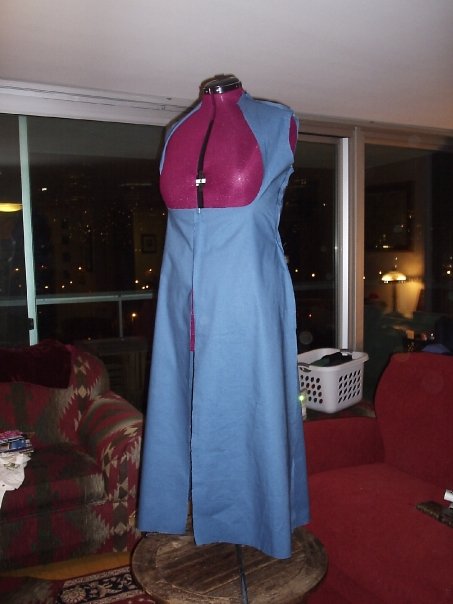 The hook and eyes (or whatever closure you prefer) will keep the coat closed in the front from as high up as you want to as low as you want. You could button it to the waist, to the hips, or to the floor. I like it to button it from just under the bust to the mid hips because then there's not some weird triangle of flesh above my hip scarf. Also, another thing to decide is if you want your four panels to be attached all the way down (like a dress), or unattached (slits on the front, sides and back). I tend to have them unattached from the mid hips down, so my colorful skirt underneath can show.