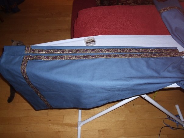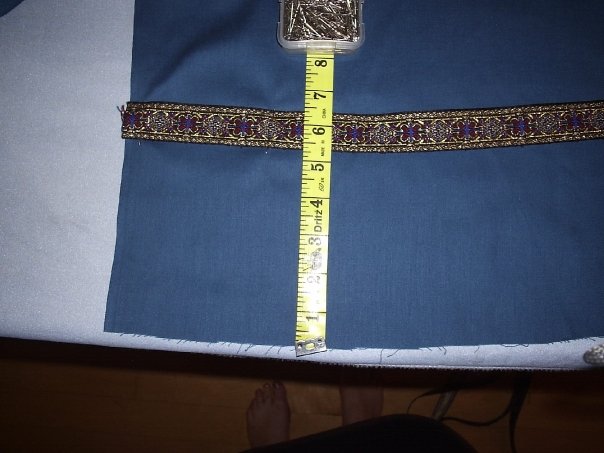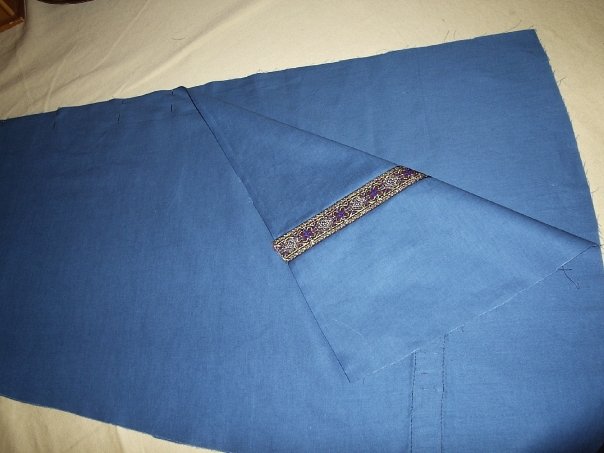 Now if you're going to sew any deorations onto the outside of the panels, such as a brocade ribbon a few inches above the hem, top stitch (straight machine stitch) these directly onto the panels, being careful to pin them on in a formation that mimics the arc of the hem, and making sure the ribbon is the same height on all four panels. (For trim that goes on the neckline and front closure, you can wait till the lining is attached.)