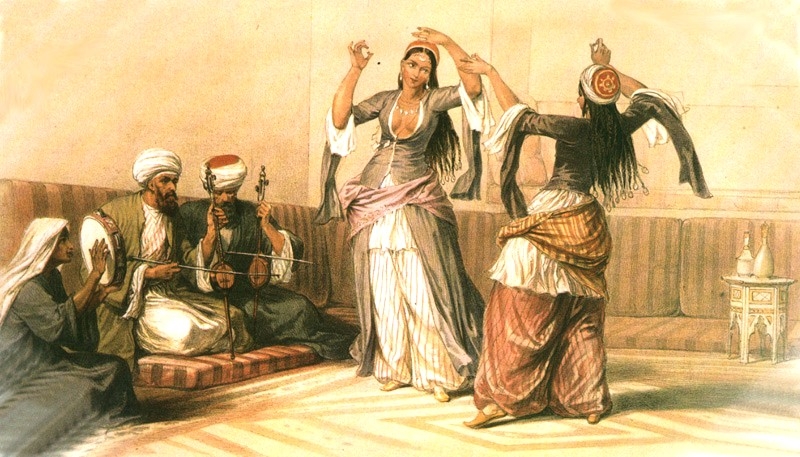 The Roma spread to Europe, the Middle East, and Northern Africa. The group of Roma who ended up in Egypt call themselves the Ghawazee (gah-wah-zee). Since their language is an Indic one and doesn't use the Latin alphabet, there are many various accepted spellings of the word Ghawazee. The garment we iconically think of as a Ghawazee coat was worn in Victorian times - late 1800's. The Napoleonic Wars were in the 1810's and brought with it many European tourists to Eqypt, creating an income for street dancers (and prostitutes). Ghawazee dancers were viewed by society as tainted whether they were prostitues or not, and though they danced in the streets, they were not typically invited to dance in people's homes. Simultaneously in Egypt there were other women who were classically trained dancers called Almehs, who only danced for other women in the harems and dressed differently.