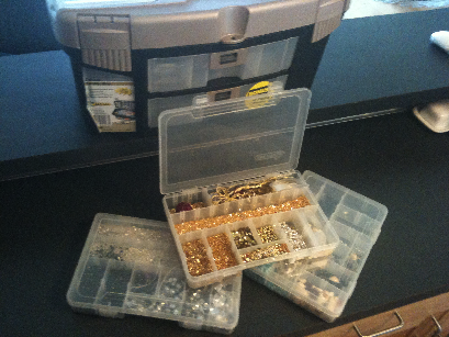 ~A Tackle Box: This is more of a recommendation. Tackle boxes are used for fishing accessories, but they are perfect for sorting and storing your beads. My box (looks like a huge tool box) has three clear plastic containers that fit into it, and each of those containers have little movable dividers inside giving me a dozen or so sections to put beads. One container is for golds and reds, the second is for blacks and silvers, and the third is for coins, shells, tribal beads and the rest. I also keep a large shoe box full of the un opened baggies of beads I've bought. Having things organized saves me a lot of time.